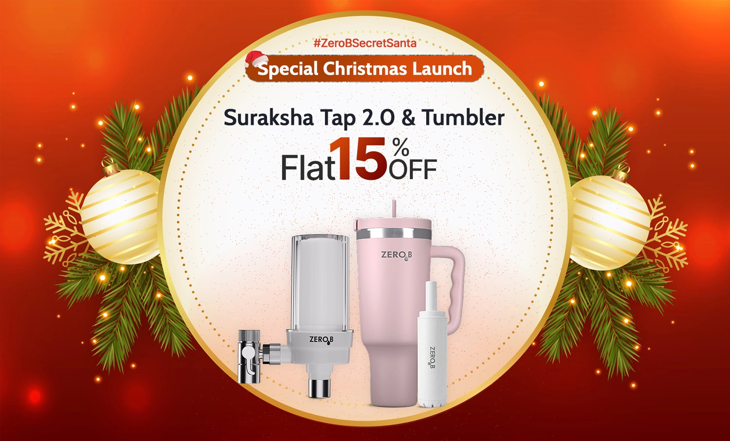 ZeroB offers flat 15% OFF on both Suraksha Tap 2.0 and the H2OHH Tumbler. The offer stays valid till 2nd Jan, covering the entire festive window.